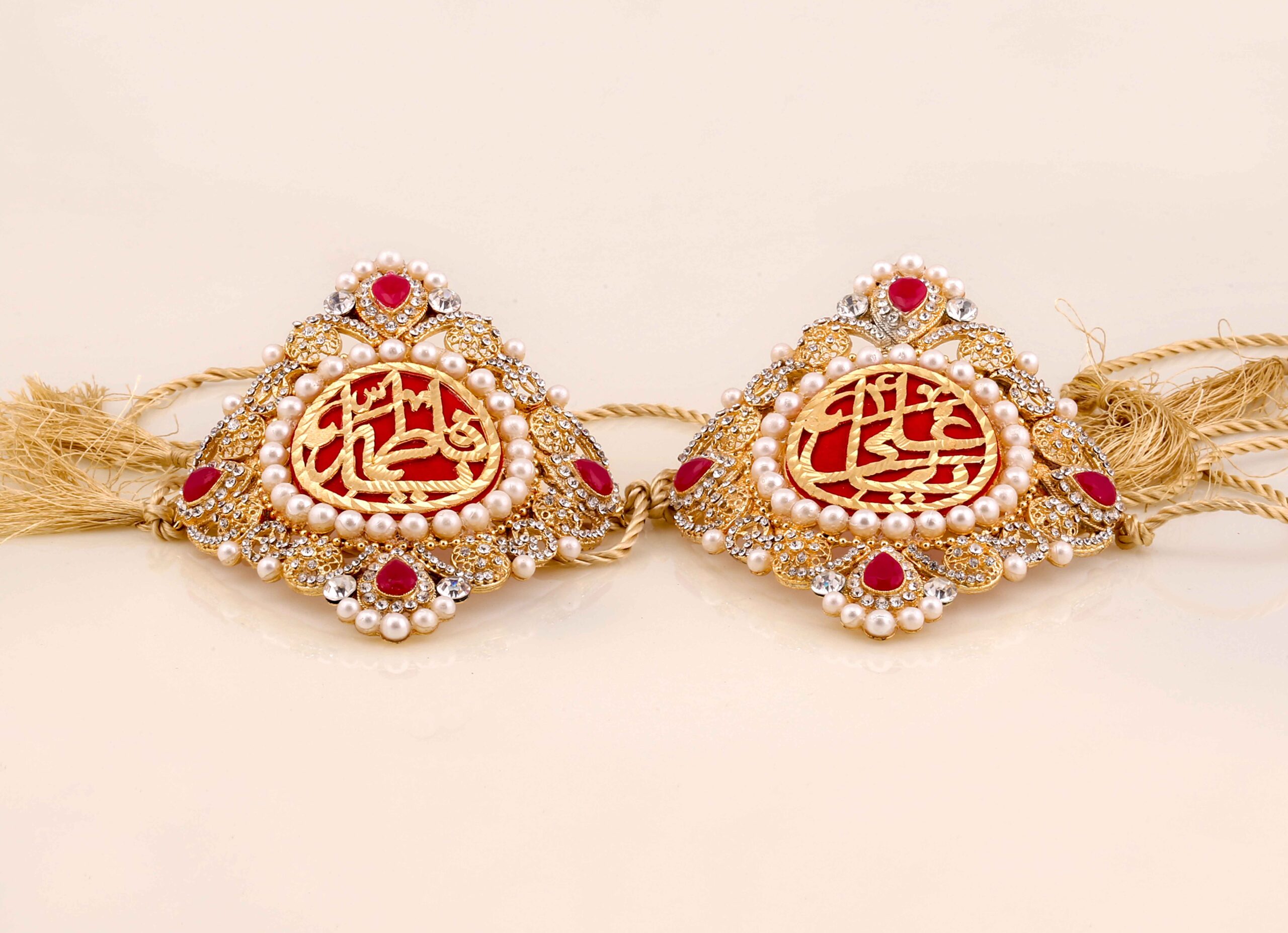 Material: Gold Plated Type Of Work: Red Stones With Golden Work Details: Elegant Gold Plated Kashi ImamZamin Adorned with White Zircorns Ya Ali (as) Ya Fatima (sa) Introducing the Elegant Gold Plated Kashi ImamZamin Adorned with White Zircorns Ya Ali (as) Ya Fatima (sa), a truly exquisite accessory. Adorned with white Zircorns and delicate pearls, it emanates elegance and sophistication. The shimmering gold plating adds a regal touch, making it perfect for special occasions. With meticulous craftsmanship, this Kashi ImamZamin exudes opulence and leaves a lasting impression. Delivery: Price Includes set of two pcs |
