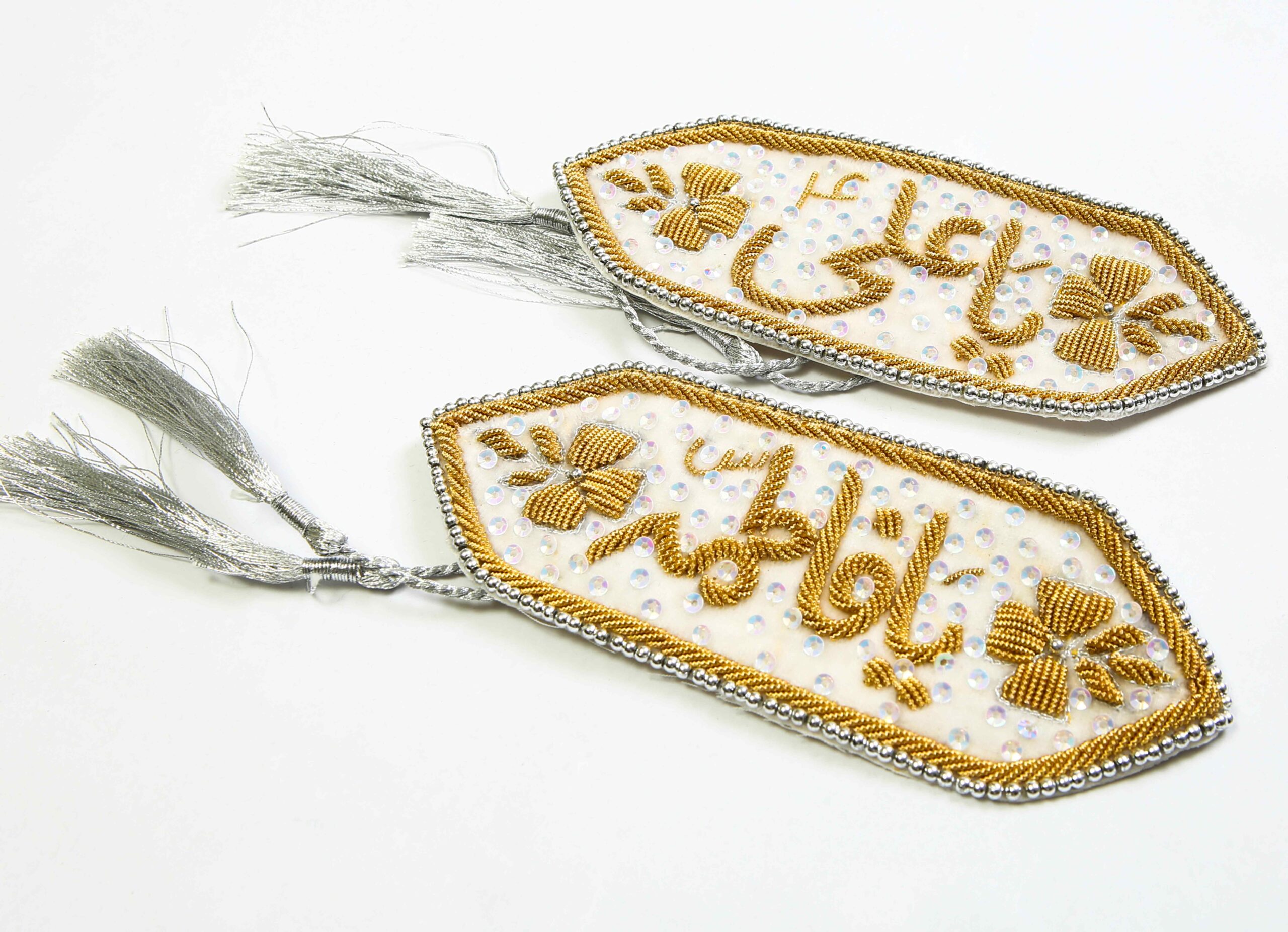 Material: White Velvet Type Of Work: Silver Kora Dapka Work Details: Radiant White Velvet Imamzamin with Gold Plated Dapka Kora Designs Radiant White Velvet Imamzamin Gold Plated Dapka Kora Designs. Elegantly crafted, this exquisite piece features intricate gold-plated designs on soft white velvet. Wear it on your arm and let its regal allure symbolize your deep connection to faith. Elevate your spiritual journey with this cherished accessory.